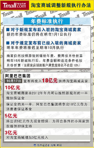按照新的扶持措施,针对2011年10月10日以前已经在淘宝商城经营的店铺,如果该商家店铺的客户满意度排名不在后10%(消费者满意评分“DSR”不低于4.6分),在2012年1月1日至9月30日期间,商家按照原规则缴纳年费(按月份数折算),之后将按照新规则缴纳,但缴纳金额和返还条件均按月折算。对于新规发布后入驻的淘宝商城卖家,新的年费标准仍将在明年1月1日执行。