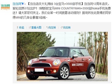 据了解,当当网不仅用"白送"来"针对"淘宝商城的"半价",在车型选择上也挑选了宝马公司在2011年年初刚刚投放中国市场的全新MINI COOPER COUNTRYMAN,比淘宝商城给出的现代、通用爱唯欧,荣威,名爵,熊猫,POLP等品牌高出几个量级。