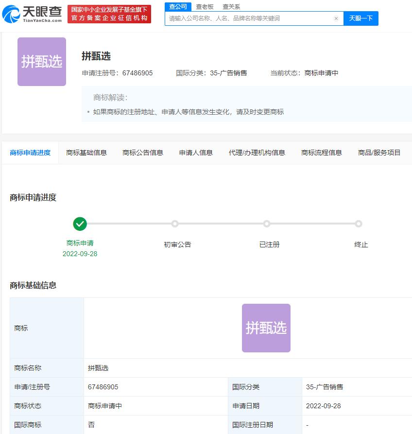 近日,拼多多关联公司上海寻梦信息技术有限公司申请注册多个“拼甄选”“拼臻选”商标,国际分类为广告销售、网站服务等,当前商标状态均为申请中。
