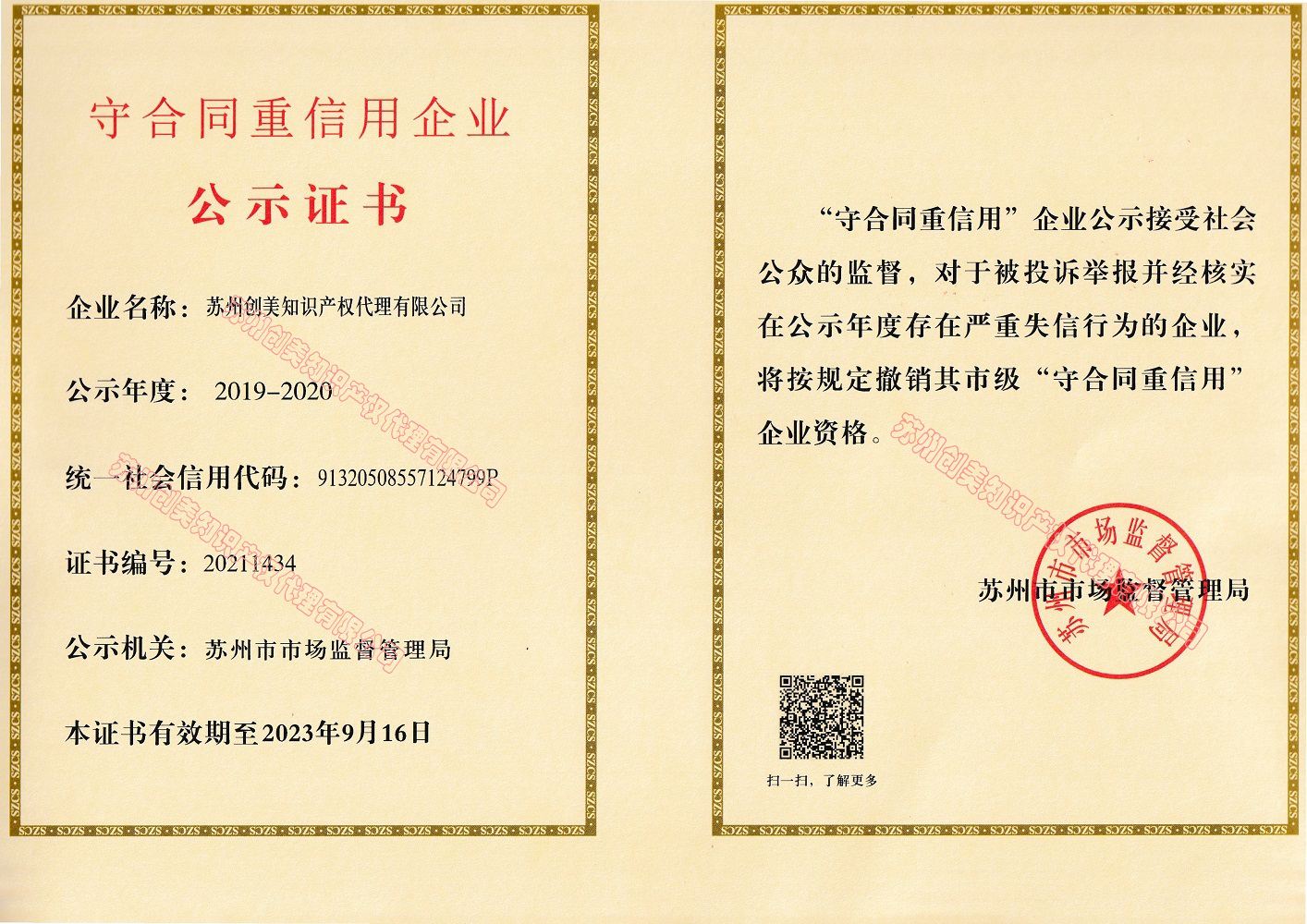 好消息!苏州创美知识产权代理有限公司凭借长期在知识产权行业的真诚服务,得到行业与社会的认可,2019-2020年度再次荣获“守合同重信用企业”的称号。